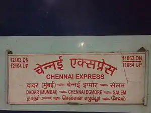 The 12163/12164 Mumbai Lokmanya Tilak Terminus - Chennai Central Superfast Express is a Superfast Express train belonging to Indian Railways - Central Railways zone that runs between Lokmanya Tilak Terminus and Chennai Central in India. Its terminal was changed in both directions from Dadar to Lokmanya Tilak Terminus and to Chennai Central from Chennai Egmore.