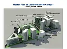 Daffodil International University (Bengali: ড্যাফোডিল ইন্টারন্যাশনাল ইউনিভার্সিটি) (DIU) is a private research university located in Daffodil Smart City, Birulia, Savar, Dhaka - 1216, Bangladesh. It was established on 24 January 2002 under the Private University Act of 1992.[2]