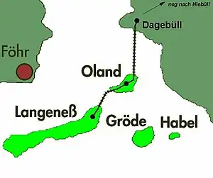 ![]() Map of Dagebüll–Oland–Langeneß island railway | ||||||||||||||||||||||||||||||||||||||||||||||||||||||||||||||||||||