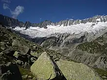 The Damma Glacier (German: Dammagletscher) is a small glacier situated in the central Swiss Alps.[1][2] It has been in retreat since around 1850.[3] The area between the front of the retreating glacier and the moraine from the most recent glacier recession – called the glacial forefield[4] – measures 10.7 square kilometres (4.1 sq mi) and is composed of granitic rocks.[3][1]