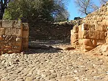 The excavators of Tel Dan uncovered a city gate made of mud bricks on top of megalithic basalt blocs, or orthostats,[21] estimated to have been built during the Middle Bronze Age around 1750 BC.[22] As of 2009, its three constituent 'true' arches were the oldest complete and free-standing monumental such arches made of mud-brick known in the world.[22] Its popular name is Abraham's Gate, due to the biblical story that Abraham travelled to Dan to rescue his nephew Lot (Genesis 14:14:). The gate was restored in the late 2000s, and has become a popular tourist attraction.[23]
