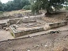 At the Israelite gate there is a raised square platform reached by two steps. Decorated stone sockets in the corners may have been created to hold canopy poles. It may have been the base of the king's seat, where he would sit in judgment.[27]
