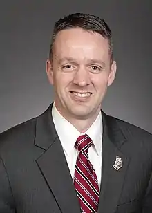 Dan Dawson (born 1978) is the Iowa State Senator from the 10th District.[1] A Republican, he has served in the Iowa Senate since being elected in 2016. He is an investigation agent of the Iowa Division of Criminal Investigation and served in the United States Army in Iraq and Afghanistan.[2] He was born in Omaha, Nebraska and currently resides in Council Bluffs, Iowa with his wife Chrystal and his two kids.[3]
