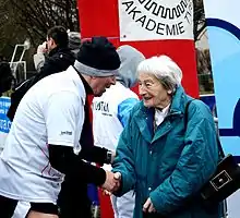 Dana Zátopková (Czech pronunciation: [ˈdana ˈzaːtopkovaː]; née Ingrová [ˈɪŋɡrovaː], 19 September 1922 – 13 March 2020)[1][2][3] was a Czech javelin thrower. She won the gold medal for javelin at the 1952 Summer Olympics (only an hour after her husband, Emil Zátopek, won the 5,000 m),[4] and the silver medal in the 1960 Summer Olympics. She was the European champion in 1954 and 1958. She also set a world record in 1958 (55.73 m) when she was 35, making her the oldest woman to break one in an outdoor athletics event.