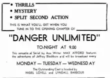 Danger Unlimited is an Australian radio series written by Max Afford which featured private investigator Jeffrey Blackburn and his wife Elizabeth.[2][3] It started in 1945 on 2UE.[4]