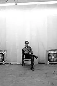 Daniel Turner studied painting and printmaking at Norfolk State University and received a B.F.A. from San Francisco Art Institute.[1] Turner worked in construction and demolition before being employed as a security guard at The New Museum in New York City.[2] He was hospitalized several times for psychosis resulting in an action titled, Burning an Entire Body of Work (2006)[3][4] in which he burned all previous paintings to date.[5] Turner now works primarily in sculpture often involving the creation or transformation of materials, objects and environments into architectural or ephemeral forms. His sculptures are often characterized by a specific response to site[6] under a controlled set of processes. This approach has enabled Turner to base form on transposition, preserving a sensory link to geographical locations, cultural associations and human contact. These elements are present in works where an entire waiting room is cast into a series of solid bars,[7] a former psychiatric facility burnished to a darkened stain against a wall,[8] or a cafeteria dissolved[9] across the expanse of a floor.[10] In 2019, Turner extracted one metric ton of hospital beds from The Vinnitsa Regional Psychoneurological Hospital in Vinnitsa Ukraine which were archived, melted and recast into two solid forms. Archived 2022-03-04 at the Wayback Machine. For his solo exhibition at Kunsthalle Basel (2022), the artist extracted elements from three sites in the Basel region that triangulate between architecture, the pharmaceutical industry, and psychology.[11] These materials included several tons of heating radiators and oil tanks which the artist removed from the interiors of the chemical plant BASF, the pharmaceutical labs of Novartis, and former psychiatric facility Holdenweild.[12] Material excavated from each of the three sites were melted into minimal forms and burnished into the surface of large scale works on canvas.[13] [14][15]