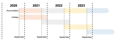 The holiday period will commence 1 May 2020 until 31 August 2020 during the transition period, and the 16.64 days obtained from 1 January 2019 to 31 August 2019 can be claimed then.[27] Any holiday days not used will be carried over to the new scheme.[2]