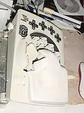 It consists of two separate "keyboards", one for the left hand and one for the right. Each finger activates five buttons: the four compass directions as well as down.[9] The thumbs also have five buttons: one inside, two outside, up and down.[10]