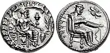 Coin of Datames. The reverse shows Datames wearing a Persian dress whilst inspecting an arrow, and the obverse shows Baal