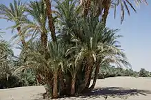 Date palm trees and Doum palms (Hyphaene thebaica) are perfectly adapted to the regional climate of Dar al-Manasir. They are drought resistant and can withstand the exceptionally hot dry and rainless summers and cold dry winters. The proximity of Ashu land to the river Nile makes the water table accessible to the deeply penetrating roots of fully grown palm trees throughout the year, making it the most valuable class of land.[4] Since dates constitute the most relevant cash crop in Dar al-Manasir their cultivation is not limited to Ashu land only, but expands along the irrigation channels of the Saqiah land. During recent years date trees even substitute seasonally irrigated crops such as wheat, beans and okra on the traditional Saqiah land.