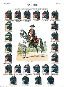 The regiment kept switch garrisons, where in 1768 in Thionville, in 1771 to Doullens, in 1772 in Verdun, then in Redon and Pontivy, in 1773 to Dôle, Dijon, and then Sélestat.[3] In 1775, reforms brought upon by Claude Louis, Comte de Saint-Germain saw a massive reorganisation of the army, which was further reinforced by the 1776 ordnance. The regimental structure was also revamped, with each cavalry regiment now comprising five squadrons, of which four are 'line' cavalry and one of light horse. When mobilised, a squadron of auxiliaries would form a new squadron, while a new depot squadron is formed from regimental personnel. The standard organisation of a squadron now therefore became: A captain (commanding), a second captain, a first lieutenant, a second lieutenant, 2 sub-lieutenants, a maréchal des logis en chef, a second maréchel des logis, a fourier écrivain, 8 brigadiers, a cadet gentleman, 152 chevaliers, 2 trumpeteers, 1 frater, 1 maréchal ferrant, totalling a total of 175 men in total, officers included.[15]