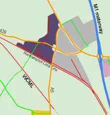 Daventry International Rail Freight Terminal is part of a land development project undertaken by Severn Trent Water on a 430 acres (174 ha) site near Crick in Northamptonshire.[1] The location, at junction 18 of the M1 motorway in close proximity to the A5, A14 and M6 roads had been identified as early as 1978 as a "motorway orientated growth point".[2] The ground area of the original DIRFT development is divided into three sections: DIRFT Central 40 acres (16 ha), DIRFT East 130 acres (53 ha), and DIRFT South 140 acres (55 ha) by the A5 and A428 roads.[3]