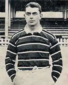 There are many tales surrounding Bedell-Sivright, and it is difficult to separate fact from fiction.[6] He had a reputation for aggression, and in 1909 became Scottish amateur boxing champion. After one international he rugby tackled a cart horse in Princes Street in Edinburgh after apparently laying down on a city tram track – this held up the traffic for an hour as no policeman would approach him.[6][7] It is not clear exactly where Bedell-Sivright picked up the nickname "Darkie". One explanation is that it was due to "cynical" tactics he employed as captain, the other is that it was due to the dark rings around his eyes.[8]