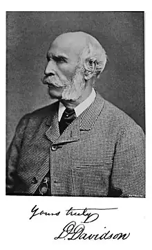 Davidson was born in Haddington where his father Henry M. Davidson was county Sheriff Clerk. He went to the local school and studied French from John Johnstone. His childhood friends included Jane Welsh Carlyle. In 1827 he moved to India to serve in the Bengal Native Infantry under the East India Company and retired in 1848 with the rank of Major. While stationed in Asirgarh Fort in 1832, he had a telescopic sight attached to a single-barrel rifle made by Samuel Staudenmeyer. The next year he wrote to the Bombay Sporting Magazine on his experiments with elongated rifle bullets with a fluted centre which he claimed increased their range and stability. He also developed a "air-cane" a walking cane with a rifle barrel and a compressed air system in the handgrip that allowed shooting a ball. He used it to kill snakes, fish and birds while on walks. He served in western India where he was a shooting companion of James Outram. He served with Edward Goldsmid and (later Sir) George Wingate on the revenue surveys[1] in the Deccan region. As part of this he introduced the use of graphs to depict revenue statistics (then supposedly novel).[2] He retired in 1848 and settled in Edinburgh where he built a mansion Woodcroft with the motto at the entrance Meliora semper cogita (lit. "Always think better") copied, according to Jane Carlyle, from a home in Haddington. He was later made an honorary colonel of the Queen's Edinburgh Rifle Volunteer Brigade. He took an interest in theology, literature and poetry. Here he also began to develop his telescoping rifle sight system working along with gunmaker John Dickson & Sons and the optics firm Alexander Adie & Sons both on Princess Street. He corresponded with Professor Charles Piazzi Smyth on this work and the idea was read in a paper to the British Association in 1850. Some of these guns were demonstrated at the Great Exhibition of 1851. In 1855 he patented a "detached collimator" and an "improved apparatus for point ordnance and restoring the aim of the piece either by day or night when it is once obtained". In 1897 he was knighted by Queen Victoria.[3][4]