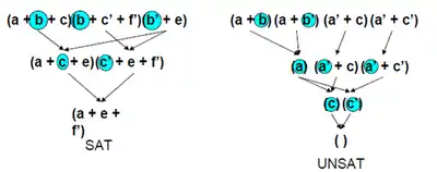The last part is a SAT solver based on resolution (as seen on the illustration), with an eager use of unit propagation and pure literal elimination (elimination of clauses with variables that occur only positively or only negatively in the formula).