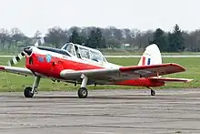The Royal Air Force (RAF) had been one of the operators to quickly take notice of the new Canadian trainer, and encouraged its formal evaluation with an eye towards procuring it. Accordingly, a total of three Chipmunk aircraft were transported to the United Kingdom, where they underwent an evaluation by the Aeroplane and Armament Experimental Establishment (A&AEE) at RAF Boscombe Down, Wiltshire.[1] Based upon this favourable evaluation, the British Air Ministry proceeded to formulate and release Air Ministry specification T.8/48 around the type as a replacement for the de Havilland Tiger Moth biplane then in use. This specification was also contested by the rival Fairey Primer, which lost out to the Chipmunk and ultimately did not enter production.[1]