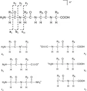 When the backbone bonds cleave, six different types of sequence ions are formed as shown in Fig. 1. The N-terminal charged fragment ions are classed as a, b or c, while the C-terminal charged ones are classed as x, y or z. The subscript n is the number of amino acid residues. The nomenclature was first proposed by Roepstorff and Fohlman, then Biemann modified it and this became the most widely accepted version.[11][12]