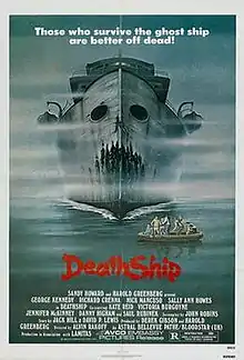 Death Ship is a 1980 horror film directed by Alvin Rakoff and starring Richard Crenna, George Kennedy, Nick Mancuso, Sally Ann Howes, Kate Reid, Victoria Burgoyne, and Saul Rubinek in an early role. The screenplay by John Robins was based on a story by Jack Hill and David P. Lewis.[5]