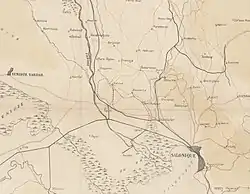 The 30–35 km (19–22 mi) long semicircular narrow gauge network with a track gauge of 600 mm (1 ft 11+5⁄8 in) from Narès (now Nea Filadelfeia, Νέα Φιλαδέλφεια) via Bumardza (now Bougaríevo, Μπουγαρίεβο), Sari-Omer (Σαρή Ομέρ), Inglis (now Anchialos, Αγχίαλος) and Topçin (now Gefyra, Γέφυρα) to Vatiluk (now Vathylakkos, Βαθύλακκος).[1]