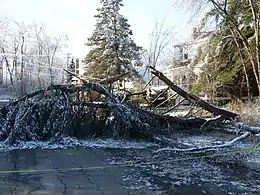 The December 2008 Northeastern United States ice storm was a damaging ice storm that took out power for millions of people in the Northeastern United States. The storm was deemed the worst ice storm in a decade for New England[2] and the most severe ice storm in 21 years for Upstate New York.[3] Damage was primarily a result of fallen trees and fallen utility wires and poles, which were coated in a heavy layer of ice. The storm raised heavy controversy over the slow return of power, as at the storm's peak, as many as 1.7 million customers were without power.[4] Days after the storm more than 800,000 customers were still without power.[5] Almost a week after the storm still more than 100,000 customers were without power, affecting the holiday shopping season and crippling the business and transportation of many northeast cities for days.[6]