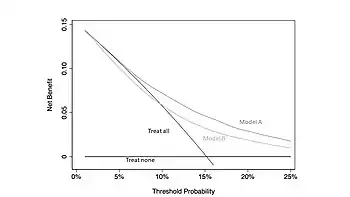 A decision curve analysis graph is drawn by plotting threshold probability on the x-axis and net benefit on y-axis, illustrating the trade-offs between benefit (true positives) and harm (false positives) as the threshold probability (preference) is varied across a range of reasonable threshold probabilities.[2]