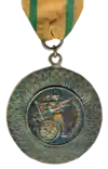 • Class II: It consists of oxidized bronze metal. It is round in shape. On its front side, the word “courage” is in the middle of the circle, surrounded by a group of swords and two branches of olives on the edges, and the phrase 'Democratic Republic of Sudan' on its back side. The medallion is worn on the chest on the left side with a ribbon of shiny silk Corrugated longitudinally divided by four white lines.[5]