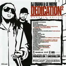Dedication 2 is the fifth mixtape by Lil Wayne, hosted by DJ Drama. It is a sequel to Lil Wayne's previous mixtape, The Dedication, and is second in DJ Drama's Gangsta Grillz series with Lil Wayne. It is one of the few mixtapes in the hip hop genre to be both financially successful and critically acclaimed.[5] Despite its illegal use of unlicensed instrumentals and samples,[4] it was sold through iTunes and retail stores such as Best Buy and FYE,[6] was widely reviewed in the mainstream media,[6] and peaked at #69 on Billboard's "Top R&B/Hip-Hop Albums” chart.[7] The cover shows Lil Wayne with "Fear God" tattooed on his eyelids.[1] Much of the mixtape showcases Lil Wayne's free associating rhymes and "liquid non-sequiturs."[3]