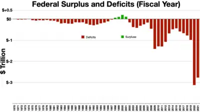 The U.S. reported budget surpluses in only four years between 1970-2020, during fiscal years 1998-2001, the last four years budgeted by President Bill Clinton. The Clinton surpluses were due to a combination of a booming economy, higher taxes on the rich implemented in 1993, defense spending restraint, and capital gains tax revenues due to a stock market bubble.[2]