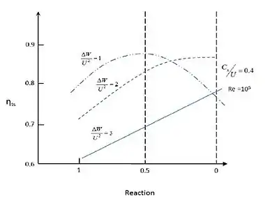 The Figure 3[4] alongside shows the variation of total-to-static efficiency at different blade loading coefficient with the degree of reaction. The governing equation is written as