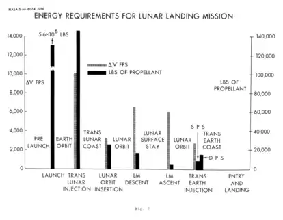 Delta-v in feet per second, and fuel requirements for a typical Apollo Lunar Landing mission.