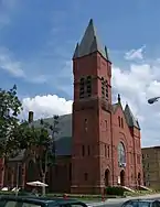 With the growth of the community, many sought to establish a Catholic church in the city which would offer mass in the Polish language. However the Diocese of Springfield did not move to establish such a parish until Rev. A. N. Dynia, a priest from Poland who had been defrocked, had begun to organize such a church there himself.[104][107] Indeed the independent Dynia would continue this pattern going westward, similarly unofficially initiating the creation of other Polish parishes as he went from town to town, only to be shunned by each respective Diocese.[108][109][110] After Dynia was "driven from the city", the Bishop appointed Father H. Chalupka of Chicopee to attend to this would-be parish, and on September 26, 1896, Rev. Anthony M. Sikorski became the first resident priest.[104] In 1901 a building designed by Holyoke's George P. B. Alderman was built and paid for by the parishioners who sold it to the Diocese at a token price, by 1902 the New York Tribune identified their community synonymous with Mater Dolorosa.[110] An influential member of the Polish community in the early 20th century was John Zielinski, who first arrived in Holyoke in 1912 to serve as the organist and choir director of Mater Dolorosa and was subsequently vice-president of the Polish Roman Catholic Union of America at one time, instrumental in the work of adjusting to American culture while keeping traditions of the Old World.[26]: 123, 126 [111][112]