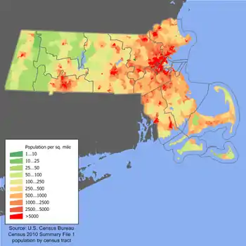 The total population is 6,981,974, making it the 16th most populous state as of 2023 estimates.[5] Massachusetts has a density of 895 people per square mile,[6] making it the third most dense of the fifty states (fifth including District of Columbia and Puerto Rico).[7]