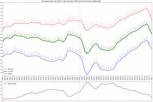 At the beginning of 2022, 320,400 babies were born between January and March, 16,600 fewer than January–March 2021. There were twice as many deaths as there were births, deaths were 584,700 people.[34] The birth rate was 8.9 new babies per 100,000 inhabitants, the lowest crude birth rate since the year 2000.[34]