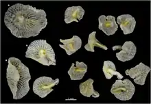 The specimens first collected were roughly mushroom-shaped, and with a mostly asymmetrical structure. So far, no sex organs or nervous system have been detected.[13] The specimens consist of a flattened, somewhat circular disc and a stalk with what was originally interpreted as mouth on the end, surrounded by lobes. The "mouth" on the end of the stalk leads to what was presumed to be a digestive canal that forks repeatedly when it reaches the disc. The individuals have an outer skin, with what was taken to be a stomach separated from the skin by a layer of dense gelatinous material (mesoglea). The stalks measure up to 8 millimeters in length, while the disc ranges from 11 to 17 mm in diameter, although the original specimens experienced significant shrinkage in full-strength ethanol after measurements were made.[1]
