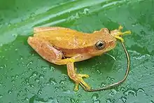 Adult males can grow to 26 mm (1.0 in) and adult females to 28 mm (1.1 in) in snout–vent length. The body is slender. The snout is truncate and short. The tympanum is faintly visible. The fingers are short and broad, slightly webbed, and have small discs. The toes are slender and long, about three-fourths webbed, and have discs that are smaller than the finger discs. At night, overall coloration is pale yellow with a white dorsolater line and a pale brown lateral stripe. By day, dorsal coloration is yellowish tan or pale reddish tan. The dorsolateral line is creamy white, and the sides are brown. The venter is white. Breeding males have yellow vocal sac.[4]