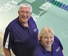 In his first year at Ferndale High School in 1967, Denny Hill won 3 meets, which he attributed to most of the senior quitting since he had been their 3rd coach and was requiring them to come to practice.[5] During his tenure as coach at Pioneer High School, the men's and women's swim teams won 31 Michigan High School State Swim Championships (15 for the men's team and 16 for the women's team).[7] After getting married in 1983, Denny and Liz Hill became a coaching team. Liz was named assistant coach of both the men's and women's teams beginning in 1984 but became co-head coach of both teams in 2005. Between 1969 and 2014, the Pioneer Men's Swim & Dive Team won the Michigan High School State Championship in the following years: 1977, 1978, 1979, 1980, 1981, 1982, 1984, 1985, 1993, 1999, 2002, 2003, 2005, 2006, and 2009. In only 6 of those 45 years did the men's team place lower than 4th place in the state championships. Between 1973 and 2010, the Pioneer Women's Swim and Dive Team won the Michigan High School State Championship in the following years: 1979, 1985, 1987, 1989, 1990, 1991, 1992, 2000, 2001, 2002, 2003, 2004, 2005, 2006, 2007, and 2008. During these time periods, the men's and women's teams won 9 National Dual Meet (Power Points) Championships (the women's team also won 3 Mythical National Championships from Swimming World). Over the course of Denny's career at Pioneer High School, the combined dual meet record was 1011-128-2 (567-90 for the men and 444-38-2 for the women.[1] The swim program produced 245 National Interscholastic Swim Coaches Association (NISCA) All-American Swimmers (140 men and 105 women) for a total of 862 All-American awards. These swimmers included Olympians Kara Lynn Joyce and Alison Gregorka. At Pioneer High School, Joyce set 4 national high school records in the 50 yard freestyle, 100 yard freestyle, 200 yard freestyle relay, and 400 yard freestyle relay before going on to swim at the University of Georgia.[8] Joyce has 4 Olympic silver metals.[9] Gregorka played water polo for Stanford University,[10] and was a member of the US water polo team that won a silver medal at the 2008 Beijing Olympics.[11] Denny also coached Dan Stephenson, who wrote The Underwater Window, a novel about competitive swimming.[12] Denny Hill was named Michigan Interscholastic Swim Coaches Association Coach of the Year 31 times, Michigan High School Coaches Association Hall of Fame Inductee in 2003, NISCA Outstanding Service Award recipient in 2005, NHSACA National Coach of the Year in 1999, and a NHSACA Hall of Fame Inductee in 2008.[13][14] In March 2014, Denny Hill was inducted into the NISCA Hall of Fame for swim coaches.[15] In November 2008, Pioneer High School rededicate their pool, "Hill Pool."[16] Denny was particularly honored that the pool naming was inclusive of both him and Liz.[16] Both Denny and Liz Hill retired from coaching the women's team in 2010 and the men's team in 2014.[7] In 2011, Eric Stanczyk took over as head coach of the Pioneer Women's Swim and Dive Team. Stanczyk swam at Eastern Michigan University and was the captain of the team in his senior year;[17] he also swam with the Hills' son, Steven, at EMU.[18] Following the Hills' retirement from the men's team in 2014, Stefanie (Liebner) Kerska took over as head coach of the Pioneer Men's Swim and Dive Team.[19] Kerska swam for the Hills at Pioneer High School, and then went on to be a 7-time Big Ten Champion and assistant coach at the University of Michigan.[20][21] While at the University of Michigan, Kerska was the first woman to be selected by CollegeSwimming.com as Assistant Coach-of-the-Year.[22] Kerska took over as head coach of the Pioneer High School Women's Swim and Dive Team in the fall of 2015.