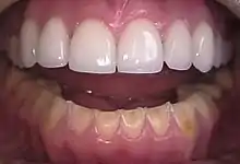 One of the physical changes can be the colour of teeth. Dental erosion can lead to two major tooth colour change – the first being a change of colour that usually happens on the cutting edge of the central incisors. This causes the cutting edge of the tooth to become transparent.[17] A second sign is a yellowish tint on the eroded tooth. This occurs because the white enamel has eroded away to reveal the yellowish dentin beneath.[17] On top of clinical examination, the dentist may take intra-oral photographs to monitor the extent and progress of erosion. Clinical photographs lead to comparable results to a visual examination, however both may result in an underestimation of the extent of tooth wear.[18]