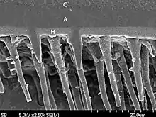 Scanning electron micrograph of the transition between composite resin (C)-adhesive (A), adhesive-hybrid layer (H), and hybrid layer-dentin.