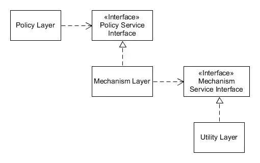 In conventional application architecture, lower-level components (e.g., Utility Layer) are designed to be consumed by higher-level components (e.g., Policy Layer) which enable increasingly complex systems to be built. In this composition, higher-level components depend directly upon lower-level components to achieve some task. This dependency upon lower-level components limits the reuse opportunities of the higher-level components.[1]
