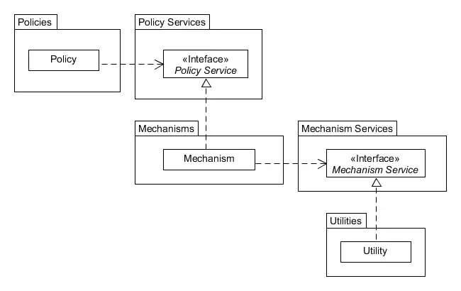 Figures 1 and 2 illustrate code with the same functionality, however in Figure 2, an interface has been used to invert the dependency. The direction of dependency can be chosen to maximize policy code reuse, and eliminate cyclic dependencies.