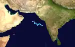 With increasing banding features, the storm strengthened while moving west-northwestward, steered by a ridge to the north.[1] At 09:00 UTC that day, the IMD upgraded the system to a cyclonic storm, estimating peak winds of 65 km/h (40 mph).[1] Soon thereafter, the storm began weakening due to increased dry air and the upper-level environment becoming unfavorable. The thunderstorms diminished and disappeared over the circulation by October 10. That day, the JTWC discontinued advisories,[11] and the IMD downgraded it to a remnant low-pressure area south of Pakistan. The storm brushed the Indian coast with rainfall, reaching 105 mm (4.1 in) in Gujarat state, although there was no major damage.[1]