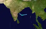 An upper-level low persisted over the Andaman Sea on November 24.[4] By the next day, a circulation center was present about 370 km (230 mi) west of Thailand, although convection was dislocated to the west due to wind shear.[14] After the thunderstorms concentrated over the center early on November 26, the IMD classified the system as a depression.[4] A ridge to the north steered the system generally westward. Outflow and convective organization gradually increased, and late on November 26 the JTWC classified it as Tropical Cyclone 03B. As the rainbands organized around the center, the winds increased; the IMD upgraded the system to a cyclonic storm on November 27, and to a severe and later a very severe cyclonic storm on November 28.[4][9]