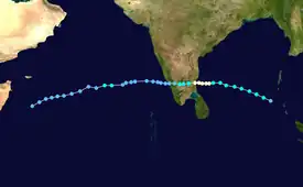 A near-equatorial trough spawned a low-pressure area on December 22 in the central Bay of Bengal. A circulation within the system developed into a depression on December 23 about 500 km (310 mi) east-southeast of Sri Lanka.[4] A low-latitude storm, the system organized while moving slowly westward.[15] On December 24, the depression strengthened into a deep depression, and the following day into a cyclonic storm,[4] the same day that the JTWC classified it as Tropical Cyclone 04B.[15] An eye developed in the center of the blossoming convection, and the system rapidly intensified into a very severe cyclonic storm on December 26. According to the IMD, the cyclone attained peak winds of 165 km/h (105 mph), and made landfall at that intensity along eastern Sri Lanka near Trincomalee around 12:00 UTC on December 26.[4] The JTWC assessed lower winds of 120 km/h (75 mph).[15] Weakening quickly over land, the storm emerged into the Gulf of Mannar on December 27 and failed to restrengthen. Later that day, it made a second landfall in extreme southern India near Thoothukudi as a cyclonic storm. Continuing westward, the system emerged into the Arabian Sea on December 28 as a depression and degenerated into a remnant low. On the next day, the remnant low merged with a trough and spread rainfall northward through India.[4]