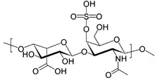 It is also referred to as chondroitin sulfate B,[1] although it is no longer classified as a form of chondroitin sulfate by most sources. The formula is C14H21NO15S. This carbohydrate is composed of linear polymers of disaccharide units that contain, N-acetyl galactosamine (GalNAc) and iduronic acid (IdoA). These repeating units are sulfated at a variety of positions.[2] Dermatan sulfate is a component of the compound sulodexide.[3]