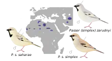 The desert sparrow (Passer simplex) is a species of bird in the sparrow family Passeridae, found in the Sahara Desert of northern Africa. A similar bird, Zarudny's sparrow, is found in Central Asia and was historically recognised as a subspecies of the desert sparrow, but varies in a number of ways and is now recognised as a separate species by BirdLife International,[2][1] the IOC World Bird List,[3] and the Handbook of the Birds of the World Alive.[4]