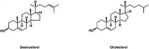 Desmosterol (Cholesta-5,24-dien-3β-ol) is a lipid present in the membrane of phytoplankton and an intermediate product in cholesterol synthesis in mammal cells.[1] Structurally, desmosterol has a similar backbone to cholesterol, with the exception of an additional double bond in the structure of desmosterol.