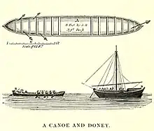 The Doney, or Tony, of the Eastern coast, is a large awkward vessel, and carries very heavy cargoes, even to the ports on the western shore of the Peninsula. They have one mast, and a square sail, sometimes using a small topsail. They are reckoned sea-worthy; but have no accommodation for Europeans, and are generally very heavy sailers.[8]