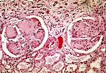Pathophysiologic abnormalities in diabetic nephropathy usually begin with long-standing poorly controlled blood glucose levels. This is followed by multiple changes in the filtration units of the kidneys, the nephrons. (There are normally about 750,000–1.5 million nephrons in each adult kidney).[8] Initially, there is constriction of the efferent arterioles and dilation of afferent arterioles, with resulting glomerular capillary hypertension and hyperfiltration particularly as nephrons become obsolescent and the adaption of hyperfiltration paradoxically causes further shear stress related damage to the delicate glomerular capillaries, further proteinuria, rising blood pressure and a vicious circle of additional nephron damage and decline in overall renal function.[9][10] Concurrently, there are changes within the glomerulus itself: these include a thickening of the basement membrane, a widening of the slit membranes of the podocytes, an increase in the number of mesangial cells, and an increase in mesangial matrix. This matrix invades the glomerular capillaries and produces deposits called Kimmelstiel-Wilson nodules. The mesangial cells and matrix can progressively expand and consume the entire glomerulus, shutting off filtration.[11]