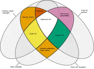 In 2013, Fuchs and Sandoval published one of the first systematic definition of diamond open access: "Diamond open access Model, not-for-profit, non-commercial organizations, associations or networks publish material that is made available online in digital format, is free of charge for readers and authors and does not allow commercial and for-profit re-use."[24] This definition is associated to a controversial stance against the leading definition of gold open access: "We argue for differentiating the concept of Gold Open Access Publishing because Suber and others mesh together qualitatively different models, i.e. for-profit and not-for-profit ones, into the same category, whereas others, especially policy makers, simply forget or exclude not-for-profit models that do not use author fees or reader fees.[24]" The debate over the relationship between "diamond" or "platinum" open access publications with "Gold" open access has never settled and remains a point of contention in 2021, even after the publication of the OA Diamond Study.[25] While valuing the study, Martin Paul Eve still consider diamond open access as a "category error".[26]