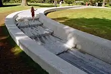 Although described as an oval stone fountain, the memorial has the form of a large, oval stream bed measuring about 50 by 80 m (165 by 260 ft); it surrounds, and is surrounded by, a lush grassy field. The granite stream bed is from 3 to 6 m (10 to 20 ft) wide, is quite shallow and is laid out on a gently sloping portion of the park, so that water pumped to the top of the oval flows down either side. One side of the stream bed descends fairly smoothly to the downhill end of the oval with gentle ripples; the other side consists of a variety of steps, rills, curves, and other shapes so that the water plays in interesting ways as it flows to the tranquil pool at the bottom. The two sides were intended to show two sides of Diana's life: happy times, and turmoil.[8][9]